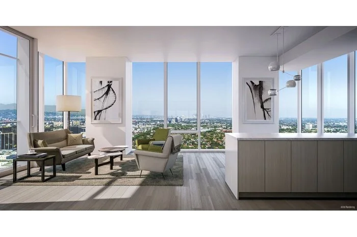 Combining advanced, leading-edge technology with timeless white-glove service provided by a house staff of 80, Ten Thousand offers the perfect home or piede-a-terre. Conveniently located at edge of Beverly Hills and Century City. The unit offers an en-suite bathroom and guest restroom, private balconies accessible via double sliding glass doors-Hardwood six-inch-wide plank floors. The kitchen offers custom Italian cabinetry, quartz countertops and mirrored backsplashes and are equipped with Bosch appliances and a Thermador refrigerator with an integrated cabinet front, and a front-loading Asko washer and dryer. Designed and constructed to condominium-caliber standards, Ten Thousand offers residents the freedoms and conveniences of leasing within a thoughtfully programmed living environment amidst 75,000 SF of amenities including indoor and outdoor pools, a 1-acre park, full bar, complimentary daily breakfast and lunch / dinner options.