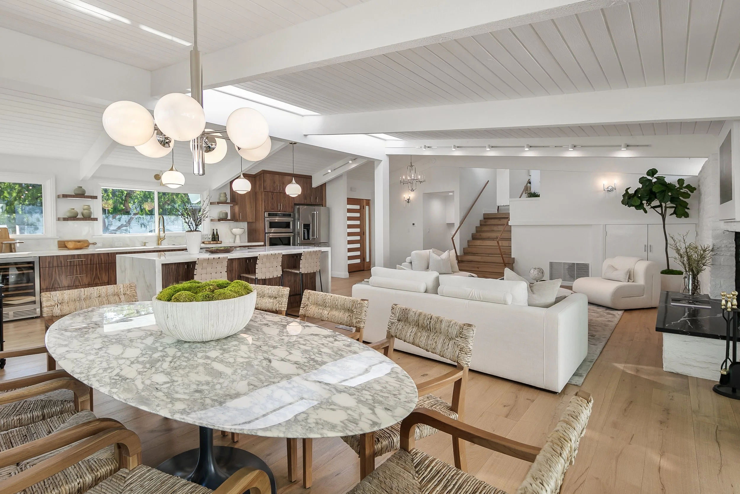 Charming, fully updated California-style mid century modern bungalow in prime Brentwood featuring a bright, open floor plan with vaulted, beamed ceilings, rich wood-detailed paneling, upgraded amenities & beautiful, contemporary interiors. This 4 bed/3 bath residence includes a large living room with fireplace, chef's caliber kitchen with marble waterfall island/eating area, alongside a large, formal dining area - all w/ easy access to the backyard space. The expansive primary suite features tall, peaked ceilings, a luxuriously-appointed bathroom with soaking tub & marble/glass shower, along with a large walk-in closet & access to the outdoor patio. Outdoors, enjoy a well-sized patio perfect for lounging, entertaining & dining, as well as an elevated, private grassy yard with ample space for kids/family activities. Other notable features include a laundry room, large 2-car garage with built-in storage, & ideally located in top-rated Kenter Elementary school district w/ easy access to city shopping/dining.