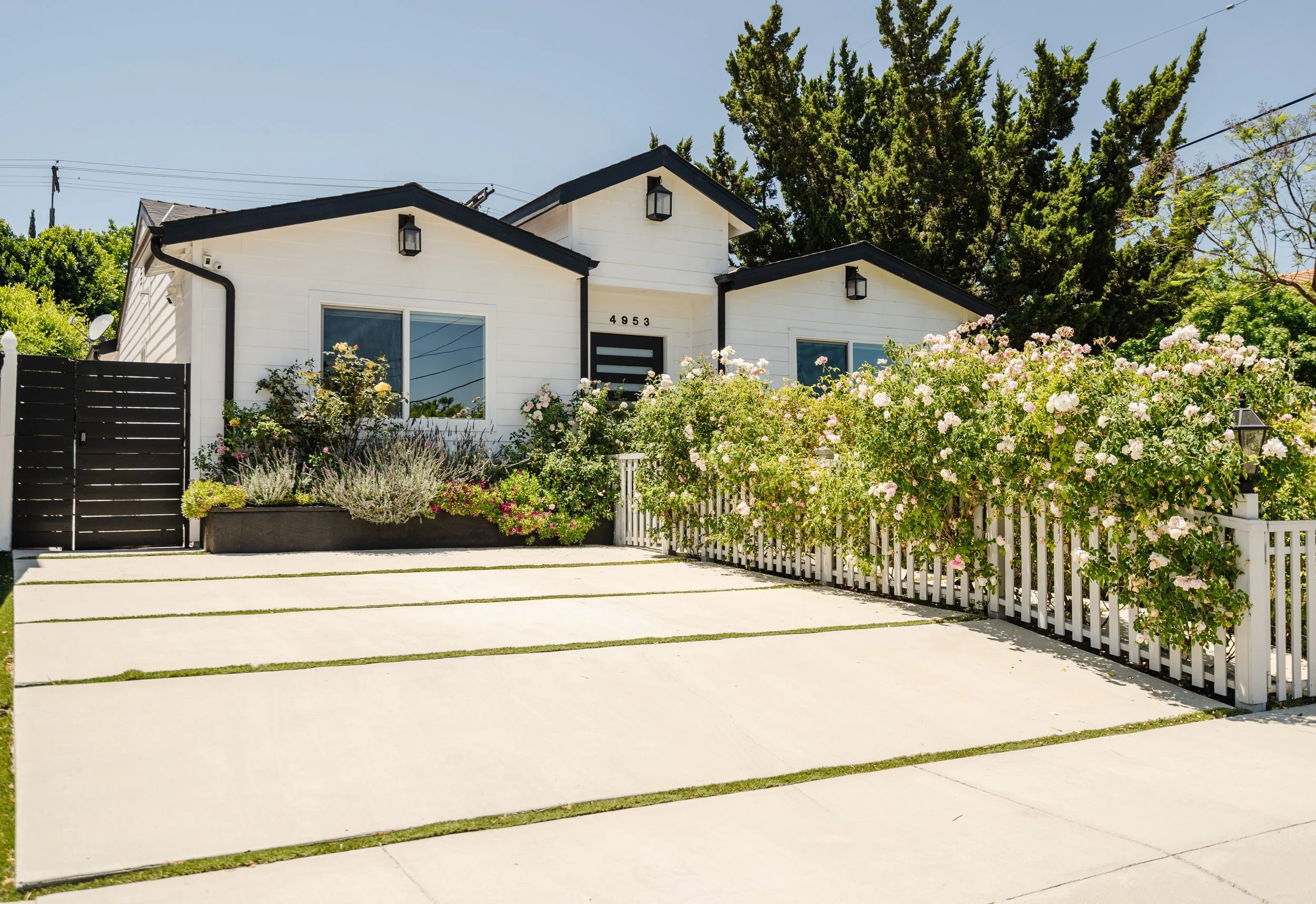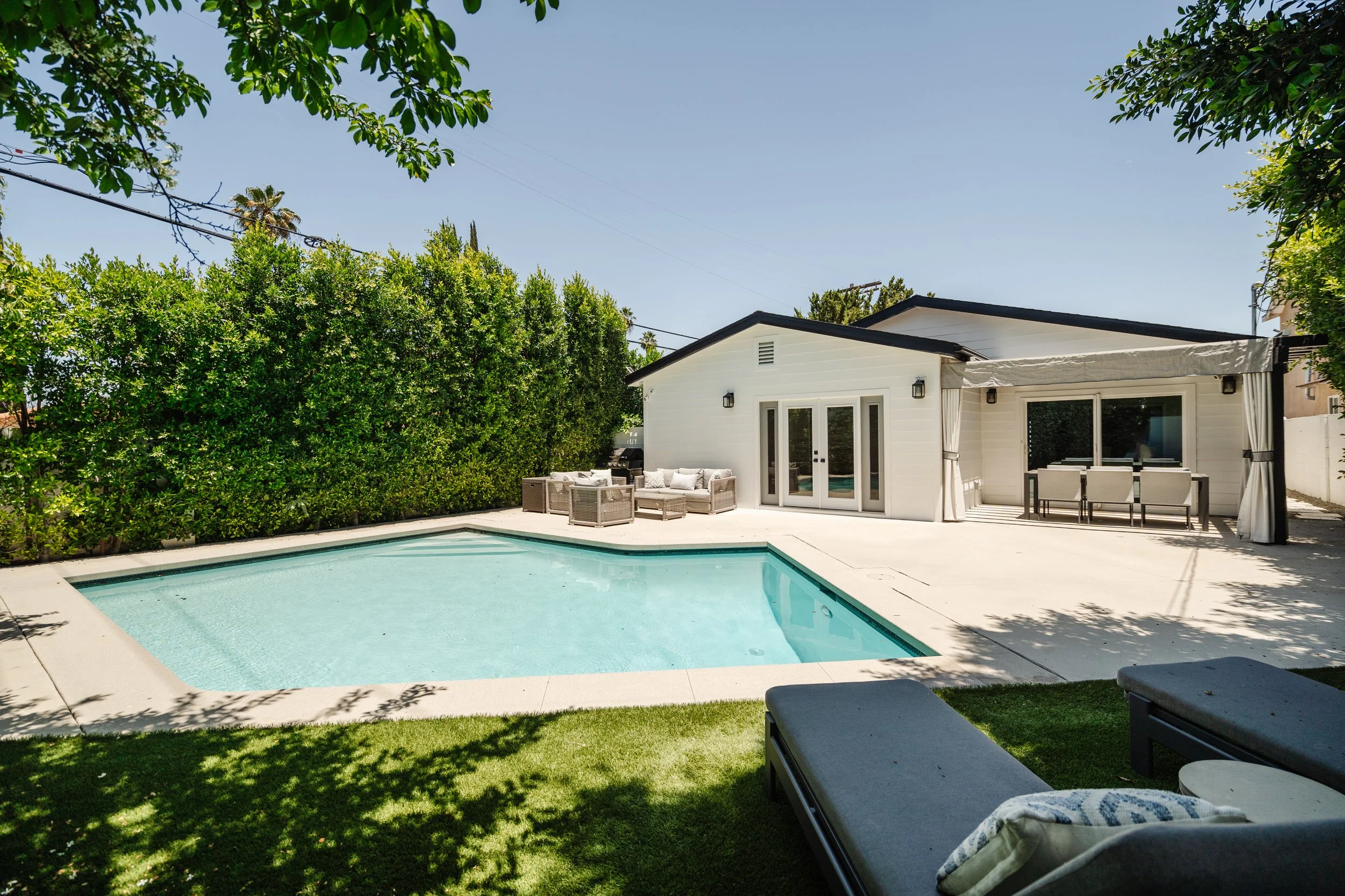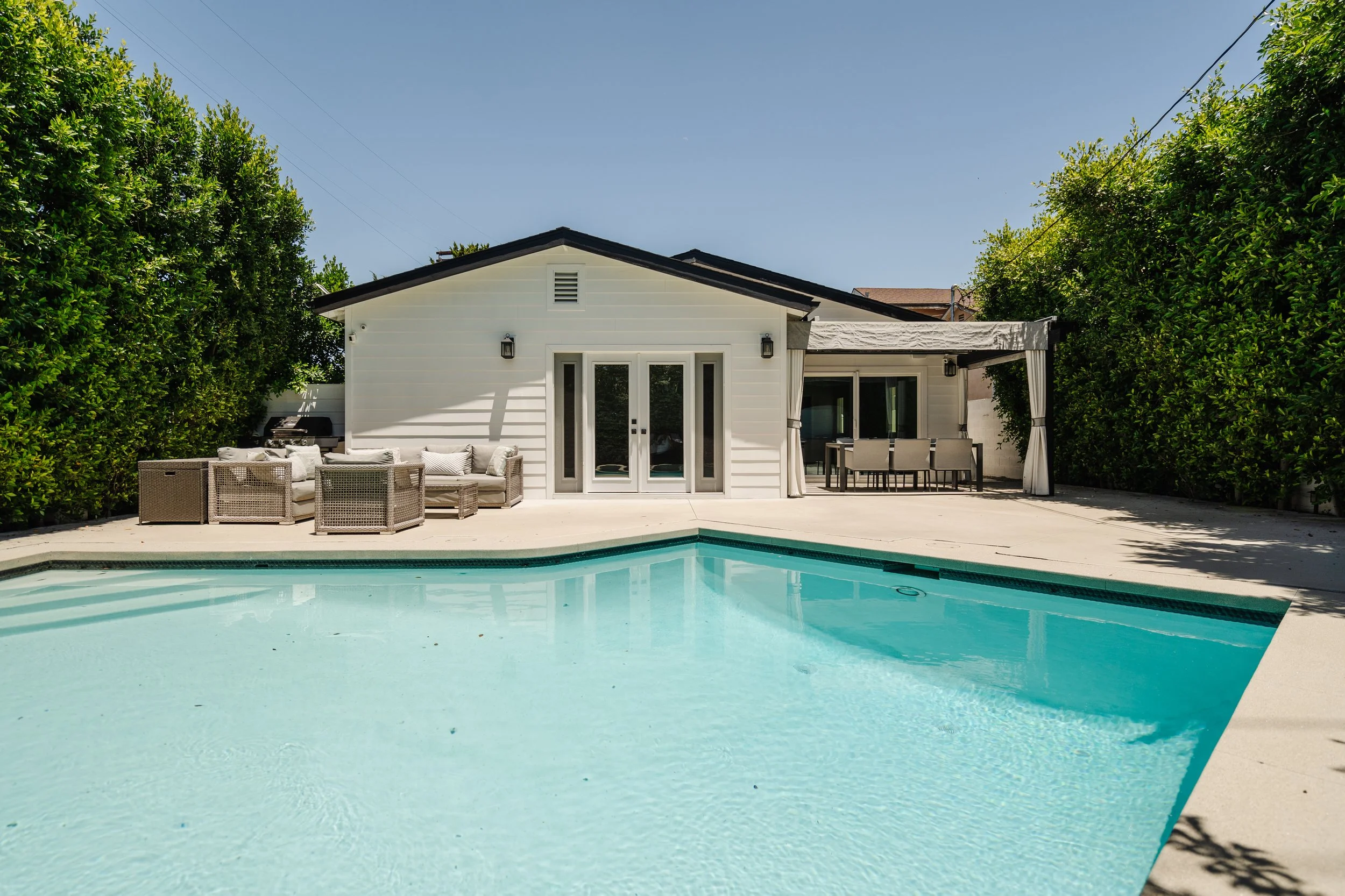 Introducing this exquisitely designed, newly renovated, four-bedroom, three-bathroom, single-level modern farmhouse gracefully situated south of Ventura Blvd. This turn-key home features an open layout, wide-plank wood floors, custom built-ins, and a sophisticated chef's kitchen complete with a walk-in pantry and expansive island. The adjoining dining room and family room, features vaulted ceilings, a mini-bar, and full surround sound, providing an ideal setting for both entertaining and everyday living.Elegant sliding glass doors reveal a private backyard oasis, showcasing a manicured lawn, a sparkling pool, and a pergola-covered patio perfect for outdoor gatherings. The primary suite is a sanctuary unto itself, with French doors offering serene views of the pool, a spacious walk-in closet, and an opulent bathroom.Externally, the property is equally impressive, featuring a wide driveway, meticulously landscaped grounds with large hedges, and a secured entrance with a gate, enhanced by a Ring security system. This residence epitomizes California living at its finest. Solar Panels are financed : $187 / Month. ~17 year term.