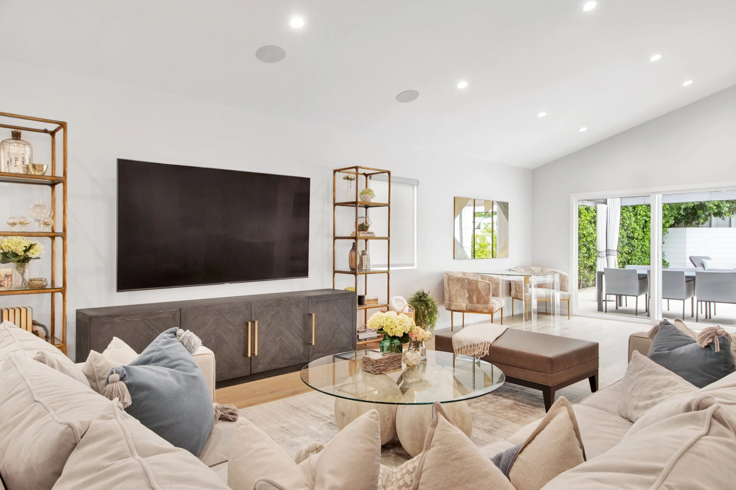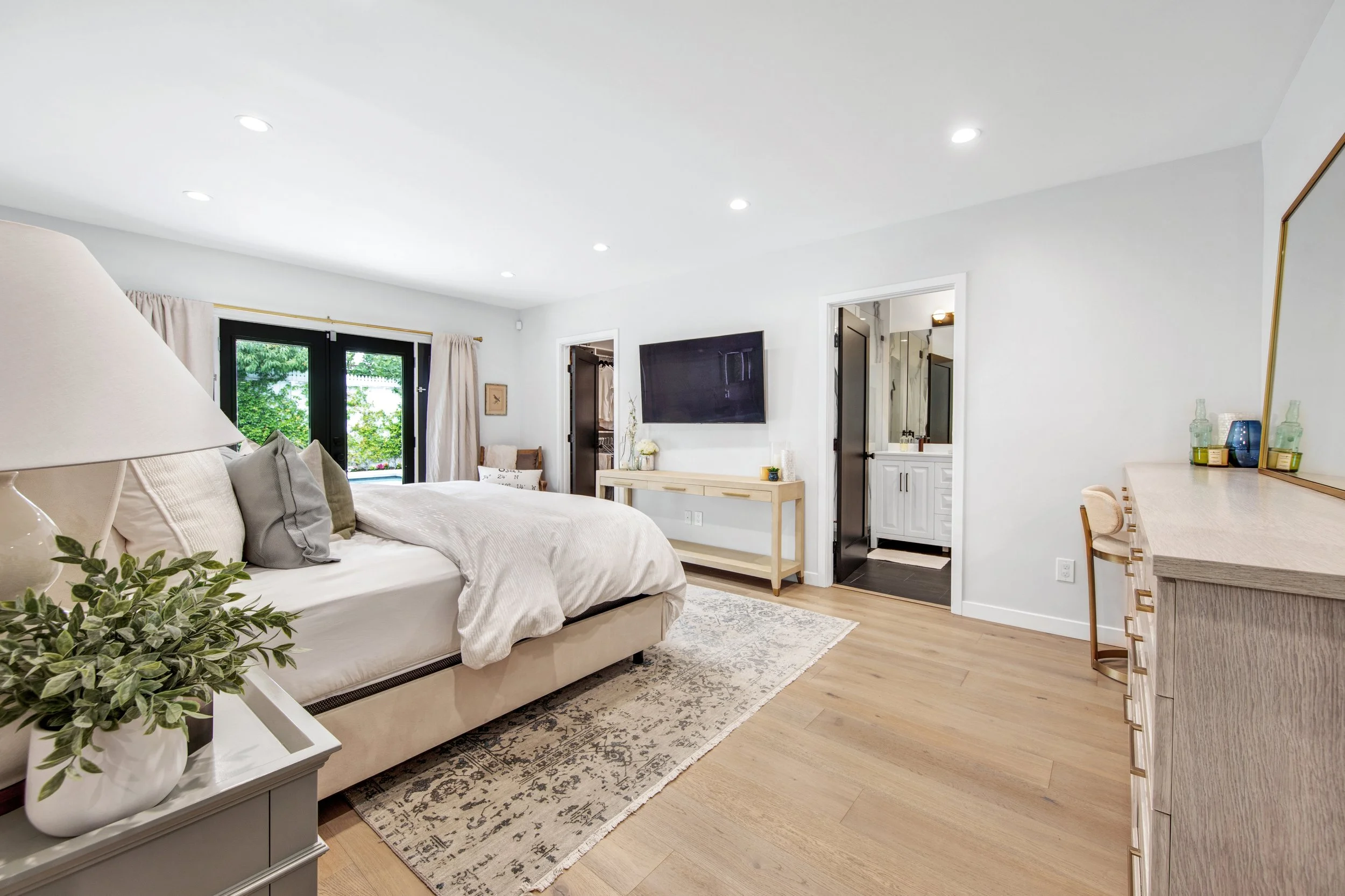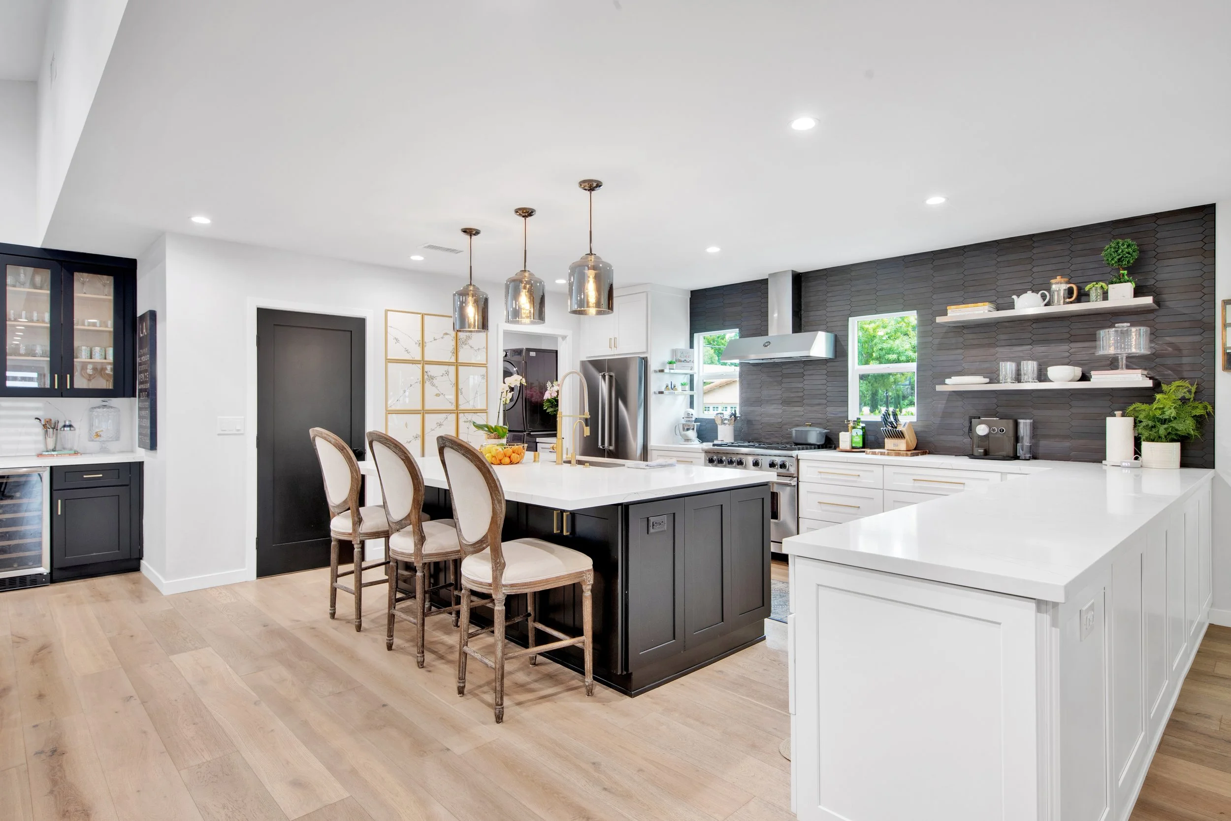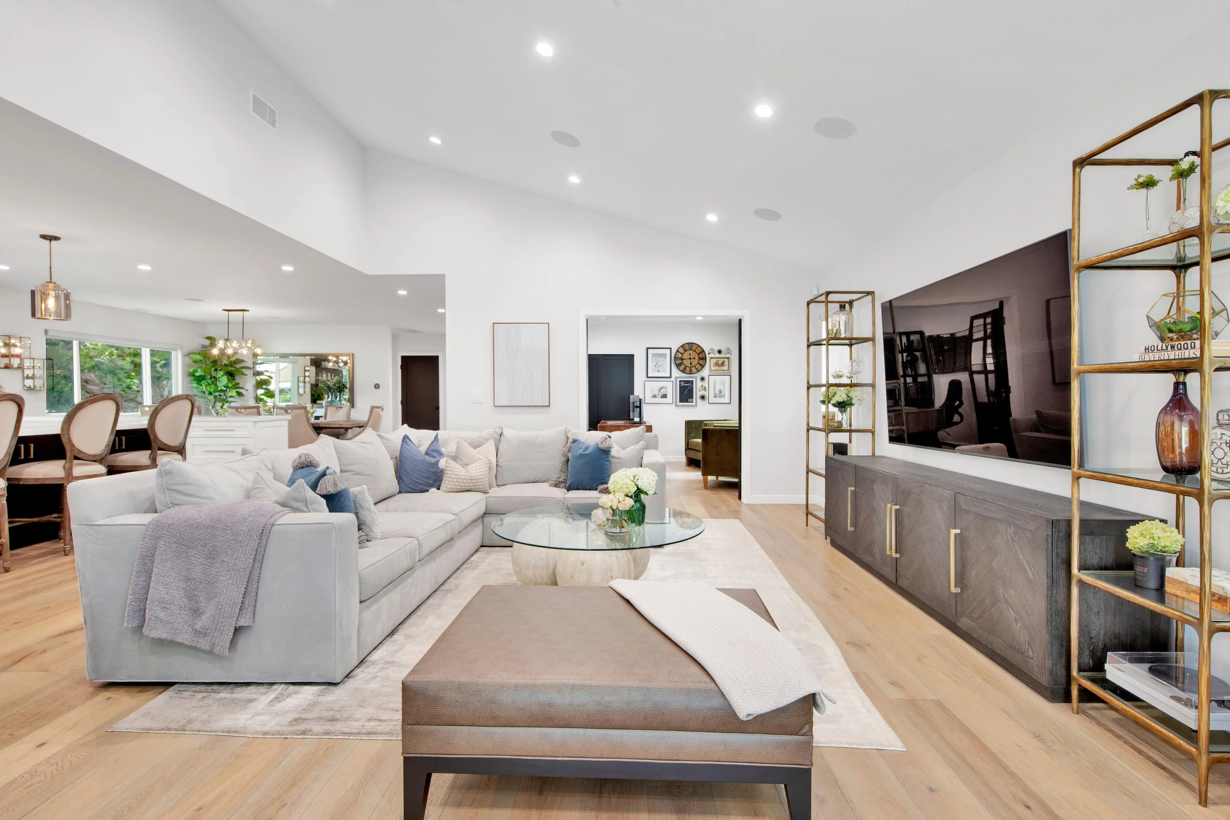 Introducing this exquisitely designed, newly renovated, four-bedroom, three-bathroom, single-level modern farmhouse gracefully situated south of Ventura Blvd. This turn-key home features an open layout, wide-plank wood floors, custom built-ins, and a sophisticated chef's kitchen complete with a walk-in pantry and expansive island. The adjoining dining room and family room, features vaulted ceilings, a mini-bar, and full surround sound, providing an ideal setting for both entertaining and everyday living.Elegant sliding glass doors reveal a private backyard oasis, showcasing a manicured lawn, a sparkling pool, and a pergola-covered patio perfect for outdoor gatherings. The primary suite is a sanctuary unto itself, with French doors offering serene views of the pool, a spacious walk-in closet, and an opulent bathroom.Externally, the property is equally impressive, featuring a wide driveway, meticulously landscaped grounds with large hedges, and a secured entrance with a gate, enhanced by a Ring security system. This residence epitomizes California living at its finest. Solar Panels are financed : $187 / Month. ~17 year term.